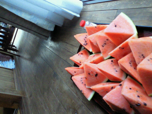 帰ってきてみんなで縁側でスイカを食べて、、