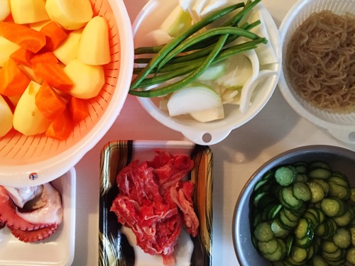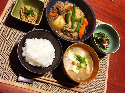 肉じゃが、タコと胡瓜とわかめの酢の物、味噌汁…