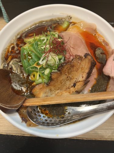 炙られたチャーシューの香ばしさと黒胡麻がめちゃめちゃいい。
